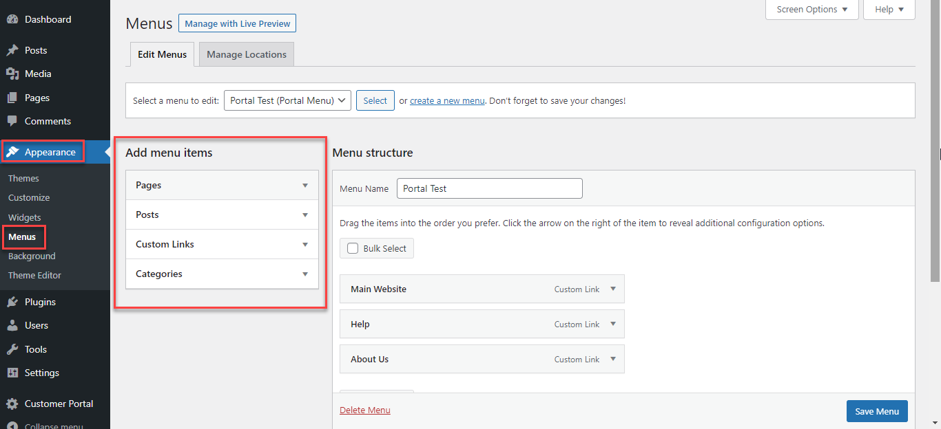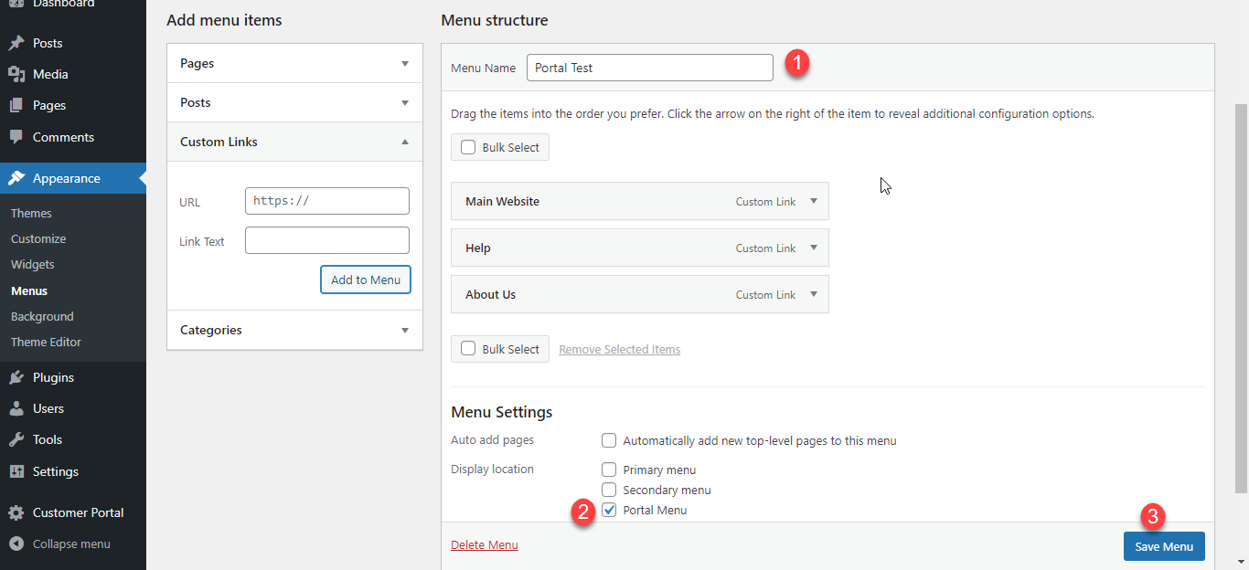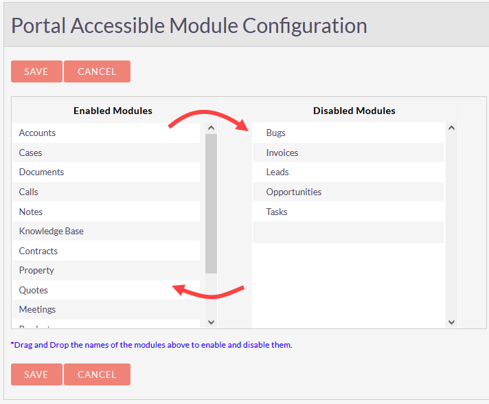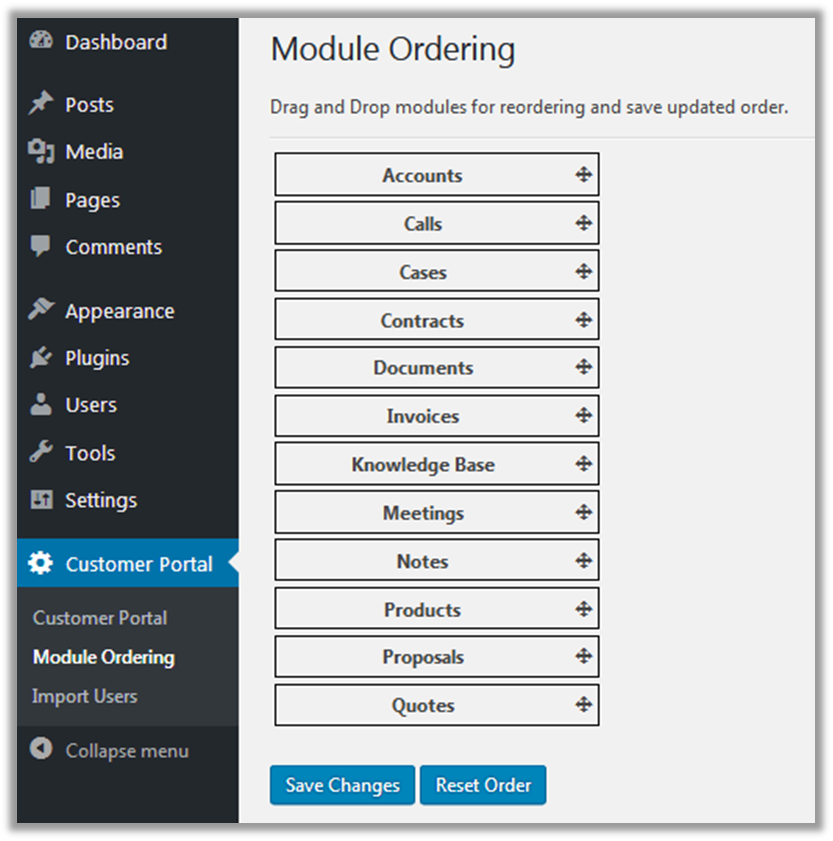 You will get the list of default and custom modules. Just need to drag and drop to make them enabled for portal users. You can decide access of which module should be provided to which customer by WordPress User Group module.