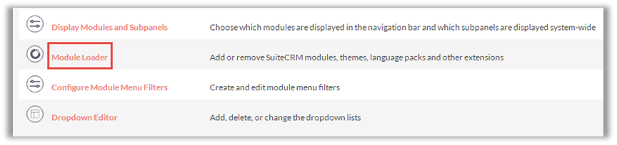 To start with the installation, Log-in as Administrator into SuiteCRM. Navigate to the Administration page and click on ‘Module Loader’ to install the package. [1]