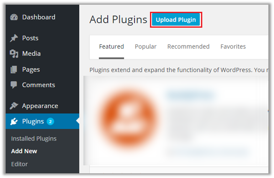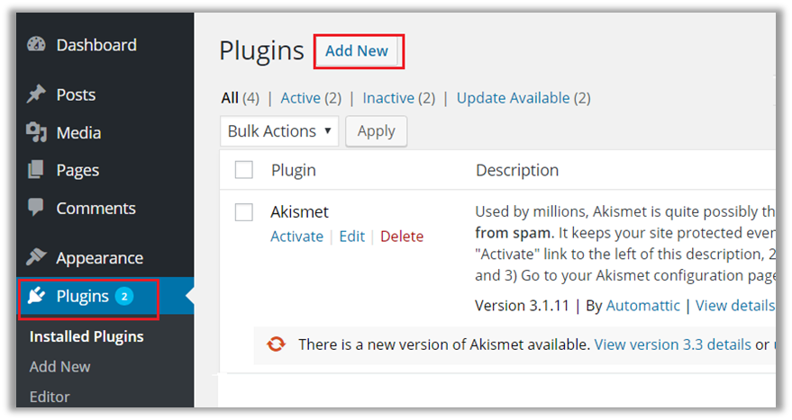Login to your WordPress portal from wp-admin and navigate to the plugin module. Here you can see the Add New Button. Click on the ‘Add New’ button which will redirect you to Add Plugins Page. [1]