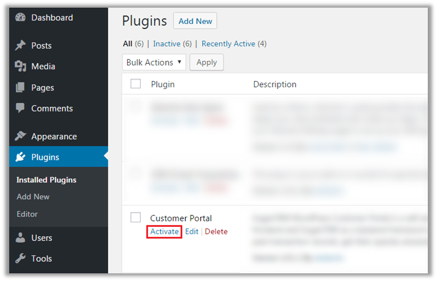Go to the Installed plugins screen. Here, you can see SuiteCRM Customer Portal Plugin was successfully installed. But still, it’s Inactive. [4]