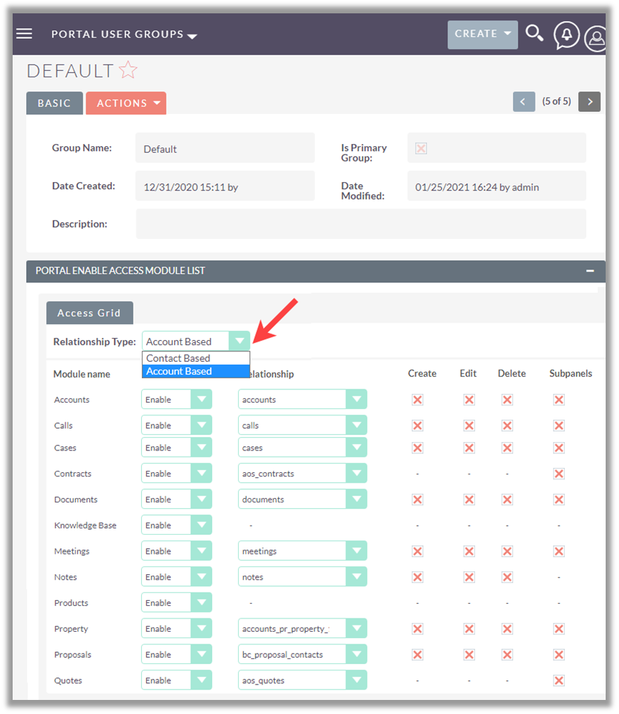 Under the “Portal Access Module List”, you will get the Relationship Type to define the relationship of the selected user group. You can select either Contact based, or Account based.