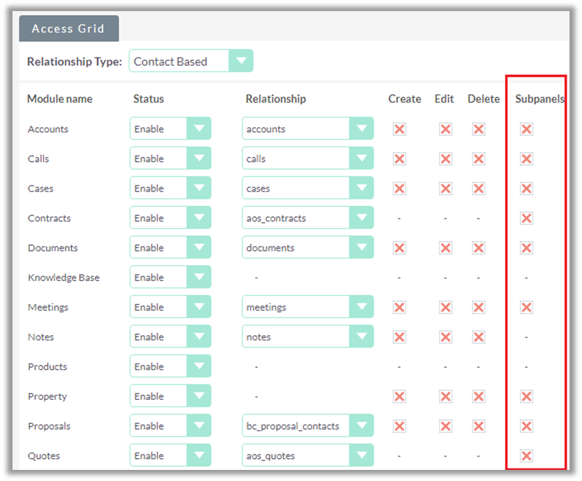 The data in the subpanels will be loaded based on the relationship with the selected Relation Type, either “Contact based” or “Account-based”. ‘Tick’ the last option to provide sub-panel’s visibility to your customers in the portal.