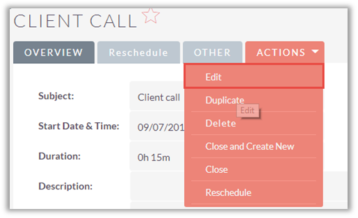 [2] Navigate to the detailed view of calls or meetings which you want to make “portal visible”. [3] Click on Action -> Edit option from detail view to edit call or meeting.