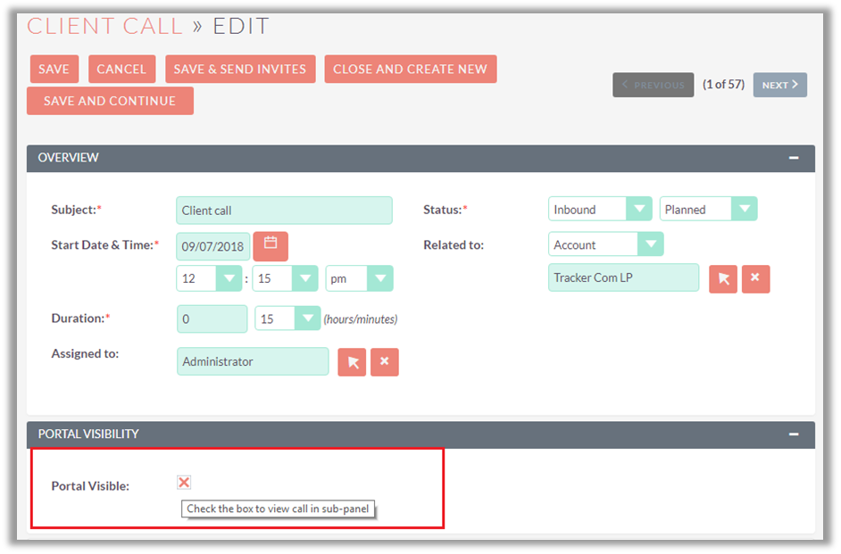 Note: For ‘Calls’ and ‘Meetings’ modules, if you want to get data listed in the sub-panel then you need to make the Portal Visible.