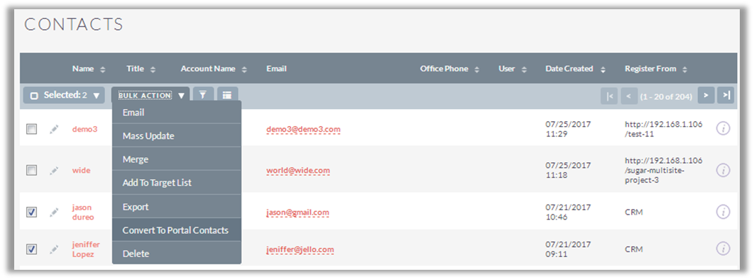 Customer Portal plug-in provides a functionality to create WordPress users from the SuiteCRM based on Contact creation. When any contact is created in SuiteCRM, you can also provide that contact an access to the portal.