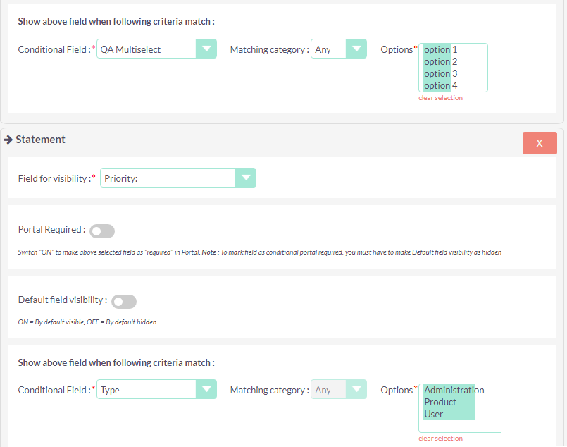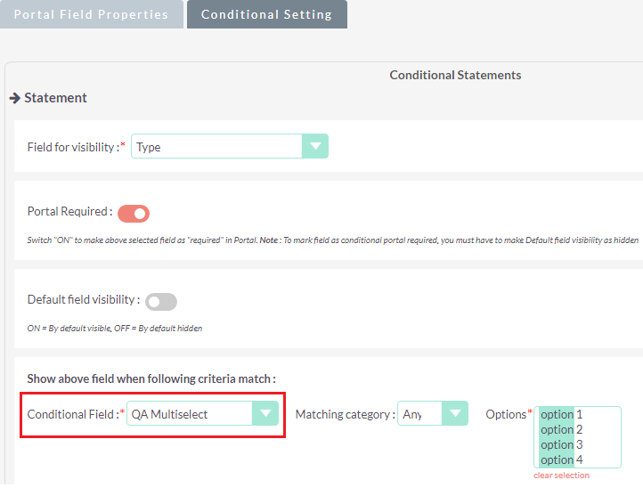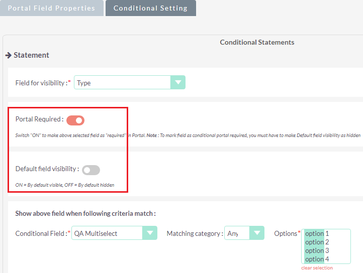 You can Show/Hide the fields to portal users based on condition match that is set and configured in the “Conditional Settings” for the fields. When the portal user selects a Field, which is set as Conditional Field, the Field which is selected in “Visibility Field” will appear in add/edit of any modules. [1]