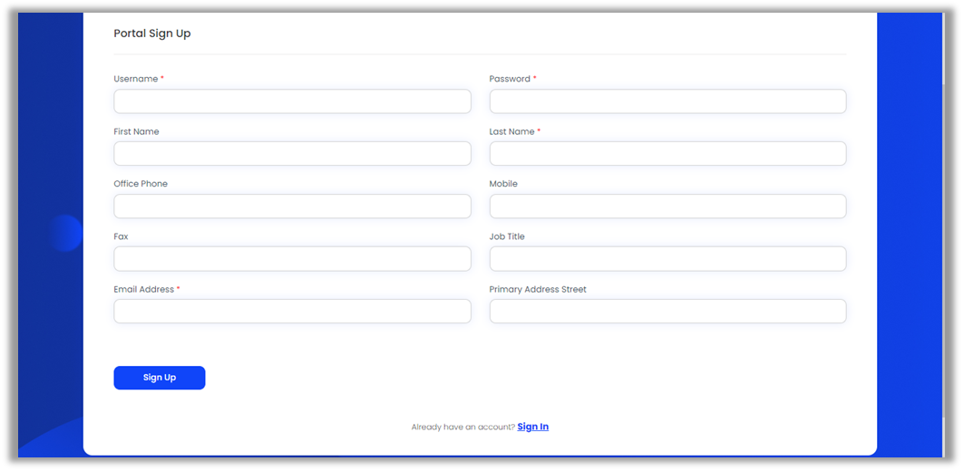 – Sign-up directly from the portal, which will also create a contact record in SuiteCRM.