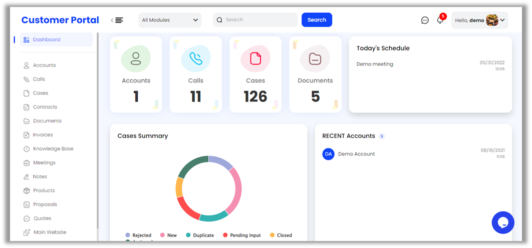 Quickly access top modules by clicking “View More”. It will also display charts for cases and quotes module to view their status.