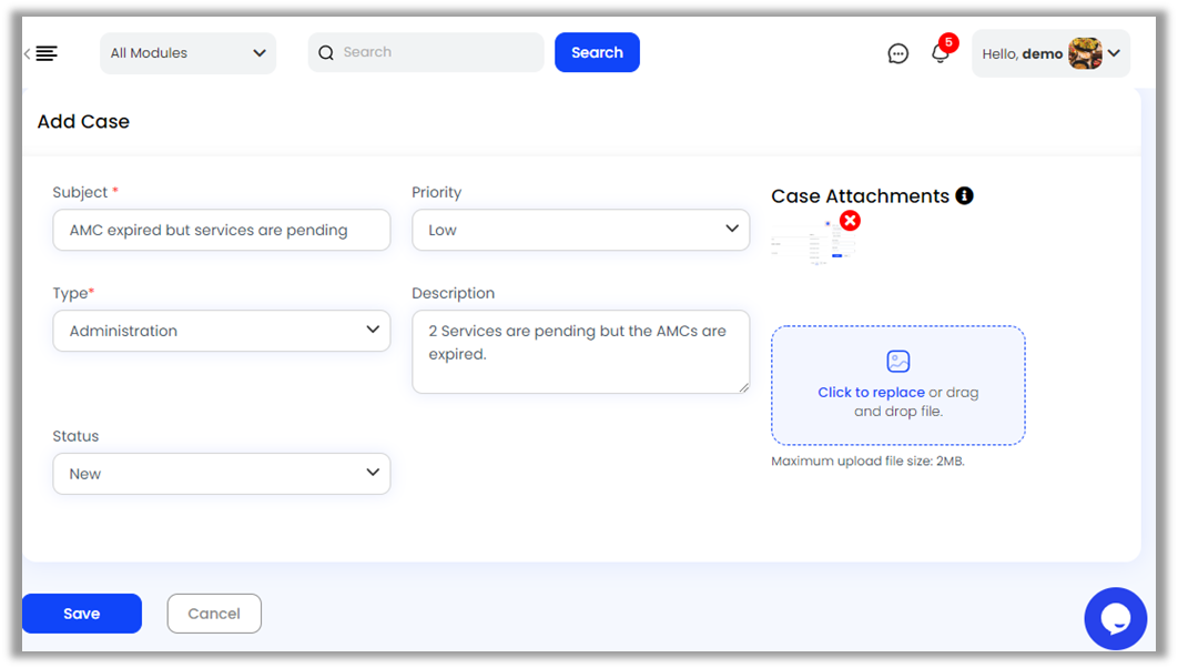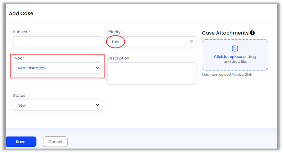 If the customer has selected the “Low” priority, then the Type field will appear while adding the case as per the conditional statements from the Conditional Settings.