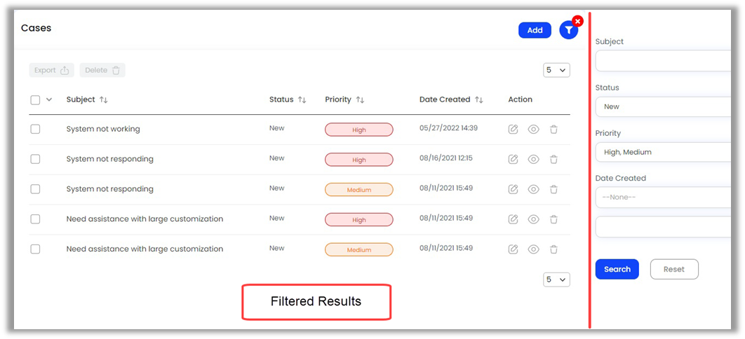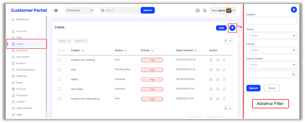 The portal users can search and filter the module records from the list. By clicking on the ‘filter’ icon, you will see the “Search” & “Filter” options. [1]