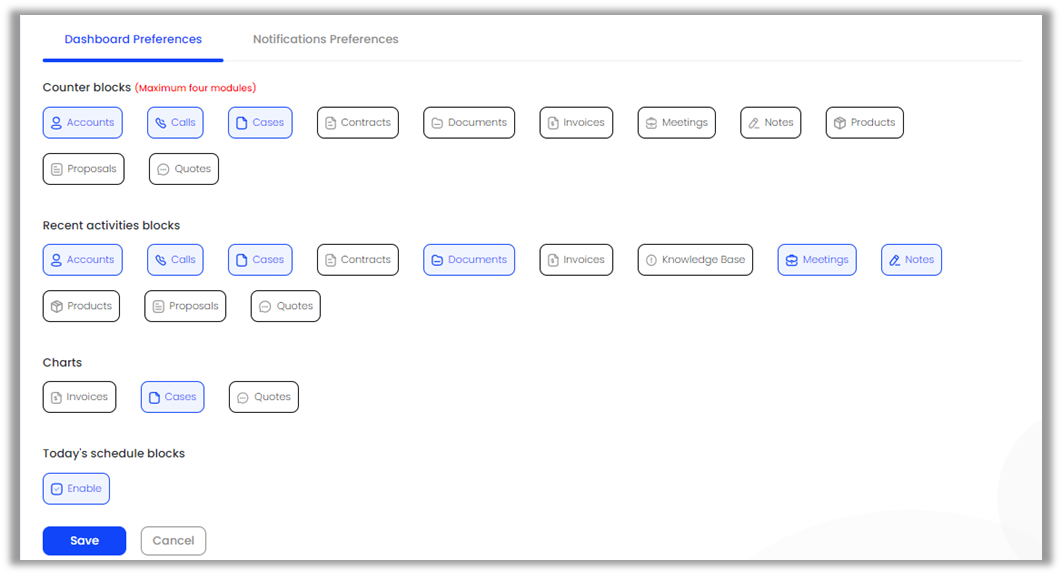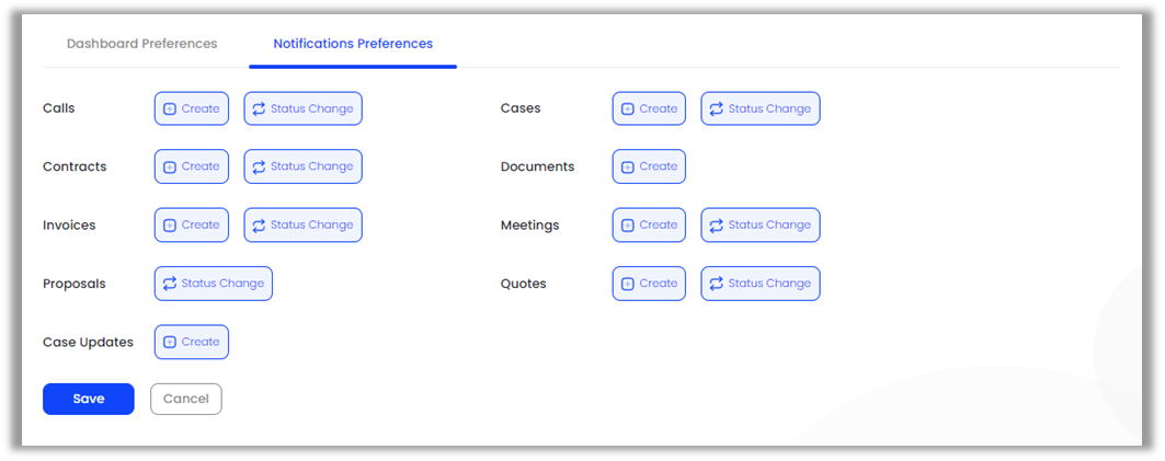 By scrolling down in Dashboard Preferences, your customers can set the preferences for the Notification. [1] Customers can set the ‘Notification Preferences’ of modules. They can tick the module for Create & Status Change