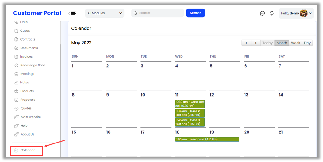 If you have enabled the Calendar option from the SuiteCRM Configuration, the Calendar will be displayed to your portal users. [1]