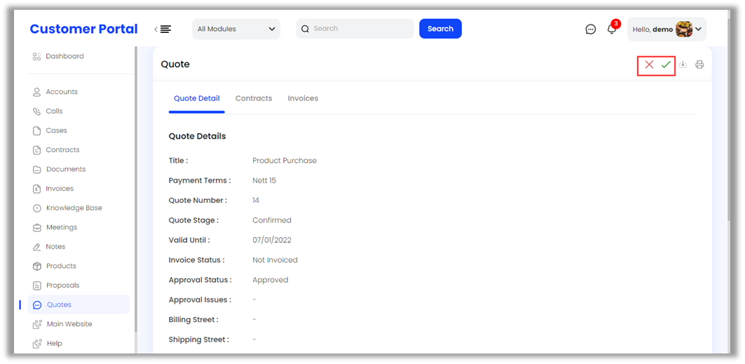 By clicking on Quote, the user can verify the details of Quote. A button to accept or decline the quote will appear in the detail view of a quote when it reaches the “confirmed” stage. [1]
