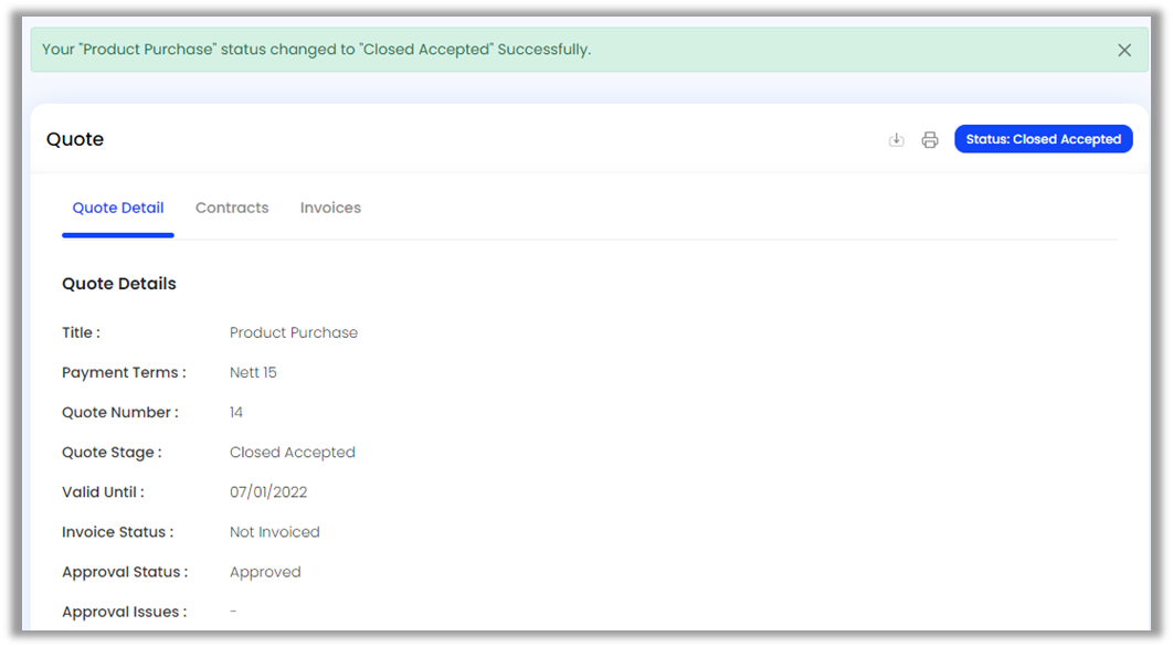 If the user ‘Accepts’ the Quote, the status will be updated to “Closed Accepted”. [2]