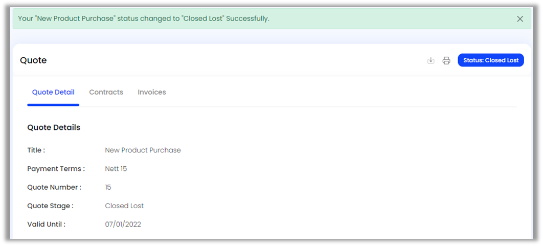 Similarly, you can also see the Status in your SuiteCRM portal as Closed Accepted and Converted. But if the customer declines the ‘Quote’, they must add a Reason for Decline. [4] The status in ‘Quote’ will be updated as Closed Lost.