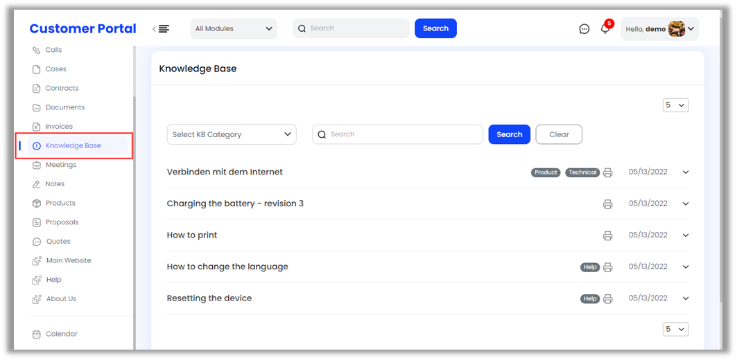 Portal user can also print details from details view for specific modules like Documents, Attachments, Notes, Quotes, Invoices and KB articles.